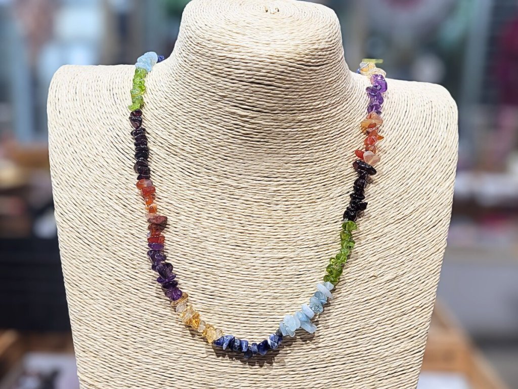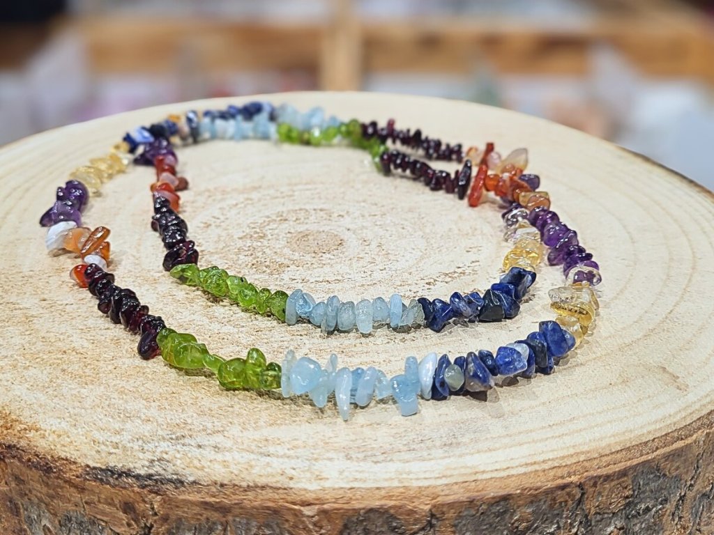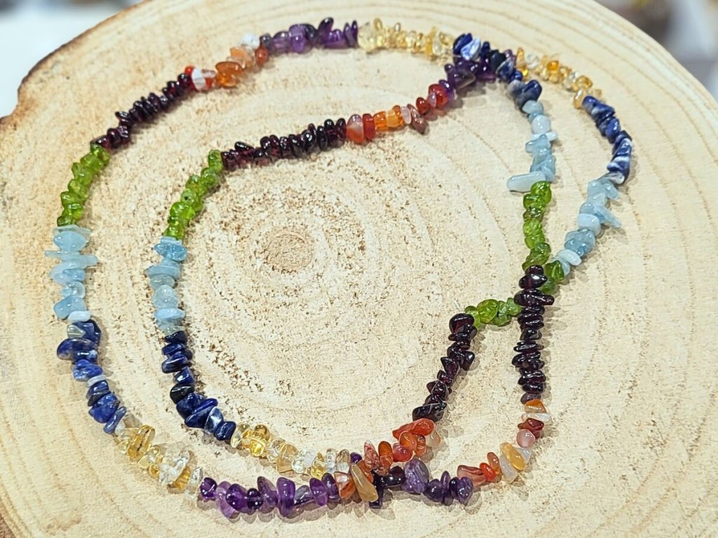 Tento sekaný čakrový náhrdelník je tvořený kombinací sedmi přírodních minerálů - ametystu, sodalitu, akvamarínu, olivínu, citrínu, karneolu a granátu. Každý z nich odpovídá jedné čakře a společně tvoří silný celek, který pomáhá udržovat rovnováhu, vitalitu a správný tok energie v těle i mysli.